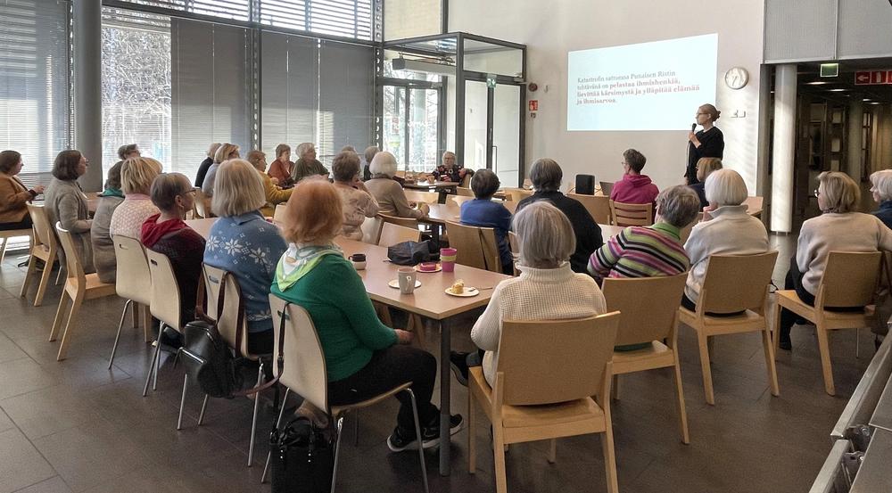 Saimme marttailtaan vieraaksi avustustyöntekijä, sairaanhoitaja Heidi Saarisen, joka kertoi Suomen Punaisen Ristin katastrofityöstä. Kuulimme myös Heidin omista kokemuksista avustustyössä Ukrainassa: “Autamme ihmisiä selviämään katastrofeista ja rakennamme turvallisempia yhteisöjä.” Auttaminen on konkreettista työtä ihmisten arjen keskellä. Heidin tehtävänä oli koordinoida apua sinne, missä sitä kipeimmin tarvittiin. Liikkuvat klinikat veivät perusterveydenhuollon palveluita alueille, joilla sairaalat, apteekit ja tiestö olivat tuhoutuneet.