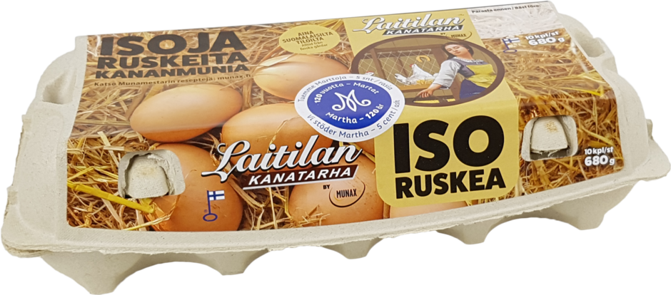 Jokaisesta myydystä rasiasta lahjoitetaan 5 cnt Marttajärjestön työhön. Kananmuna on juhlavuoden tuote, jolla on historia. Martat opettivat äideille 1900-luvun alussa kanankasvatusta ja munien myyntiä keinoksi ansaita omaa rahaa, jotta perheet pärjäisivät paremmin. Lue lisää ja myös miksi valitsimme Munaxin ulkokananmunat?